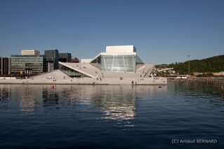 Nous arrivons au bout d’une longue marche au palais royal. Nous traversons le jardin du palais où nous avons de belles senteurs de lilas et des gardes du palais aussi droits que les gardes du palais de Buckimgham en Grande Bretagne. A la fin du jardin du palais royal, nous redescendons une avenue pour aller au port. De là, nous avons deux grands bâtiments monumentaux, d’un côté l’Hôtel de Ville d’Oslo et de l’autre le théâtre où est desservit chaque année les Prix Nobel de la Paix. Nous déambulons quelques instants sur le port en admirant quelques beaux navires à voiles. Nous remontons vers le château où nous devons avoir un joli point de vue sur Oslo, en chemin nous croisons des dizaines de jeunes se réunissant pour un grand concert. Nous longeons donc au dessus des remparts le chemin de ronde, nous avons un beau panorama, d’un côté vers Oslo et son port et de l’autre vers la baie où nous remarquons de beaux bateaux. Nous redescendons pour dîner dans un restaurant près du port. Nous dégustons une bonne assiette de crevettes roses sur des tranches de pains et du beurre. Il paraît que c’est la spécialité du port d’Oslo. Après le repas, nous continuons notre périple en remontant la grande rue Rådhusgata pour rejoindre le deuxième port. En chemin nous passons en dessous d’un grand bâtiment : le théâtre Nordic Black Theatre.Nous arrivons enfin au deuxième port.
