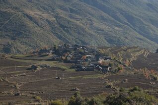 DSC_9032.jpgDimanche 18 novembre 2007 : La randonnée de ce jour était un peu périlleuse. Nous continuons le chemin dans les gorges du saut du Tigre, en passant sur des petits chemins creusés par les Naxis dans la montagne. Ce chemin passe par des endroits assez périlleux et quelque fois il fait seulement un mètre de largeur. D’un côté la falaise plong à plus de 1000 mètres plus bas vers le Yang Tsé, et de l’autre se trouve des canaux d’irrigation que les Naxis ont creusés pour rendre fertile leurs terres dans les hauteurs. Nous arrivons en fin de matinée à la prochaine auberge Tina qui a été construite à flanc de falaise. Cette auberge est plus moderne et plus confortable que celle de la veille. L’après-midi nous avions quartier libre pour nous reposer. J’ai profité de cette après midi avec deux de mes amis, et comme nous étions pas trop fatigué par la marche, nous sommes partis explorer plus d’avantage le coin. Nous avons continué la route un peu plus loin et nous avons trouvé un chemin qui descend 500 mètres plus bas vers le fleuve Yang Tsé. Nous avons donc pris les dernières photos du fleuve et nous sommes remontés par le même chemin à la route pour rentrer à l’auberge. La montée était un peu plus difficile et fatigante, en plus il faisait chaud !