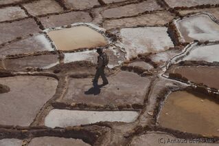 Nous reprenons le bus pour faire quelques kilomètres en rase campagne et nous nous arrêtons au milieu d’un village. Nous allons faire quelques kilomètres à pied pour rejoindre un site complètement différent : les salines de Maras. Nous sommes émerveillés par ce site, c’est un magnifique patchwork de couleur rouge, marron et blanc. Ces salines sont composées d’une multitude de petits bassins de toutes couleurs. Elle date aussi du début des Incas, le sel sert aujourd’hui à l’exportation, mais plus spécialement pour la consommation personnelle des péruviens. Ce sont vraiment les seules dans ce pays. Nous longeons par le haut un tout petit chemin jusqu’à la source qui est minuscule. Nous voyons dans quelques bassins, des ouvriers ramassant le sel avec des raclettes. C’est vraiment un très beau paysages de couleurs : le sol rouge, orange, marron, blanc et le ciel d’un bleu très foncé avec les nuages blancs et gris. Nous reprenons la route pour aller déjeuner une heure plus tard à l’endroit où nous avons passé la première nuit chez l’habitant à Chinchero, chez Sonia exactement. Après le déjeuner nous retournons vers Cuzco où le début d’après-midi est consacré à la visite de la cathédrale que nous n’avons pas pu visiter le premier jour. Le reste de l’après midi sera libre pour la visite de la ville. Le soir nous avons dînés dans un très bon restaurant italien pour changer un peu.
