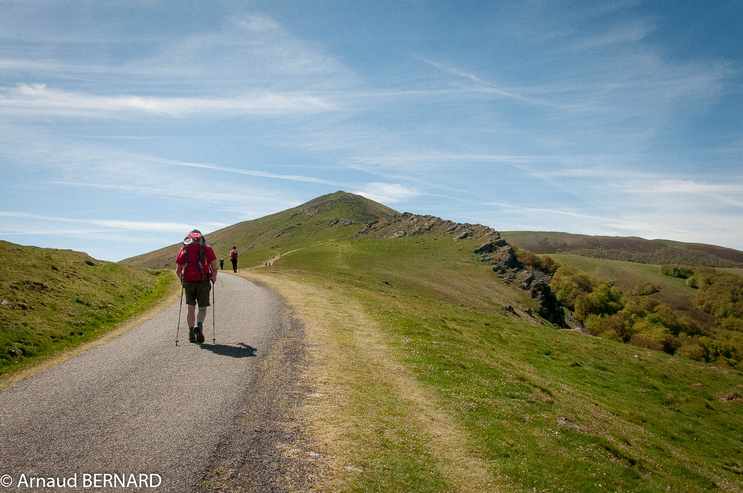 Lundi 8 mai 2017 : Nous nous levons vers 7h00 empressé de partir enfin après quelques mois d'absence sur ce chemin. Mais nous avons quand même une petite appréhension. Aujourd'hui est normalement la journée la plus difficile du séjour, car nous devons passer le plus haut des Pyrénées en une journée. C'est à dire que nous allons faire une marche de 26 kms et monter en altitude de 200 à plus de 1500 mètres en une journée ! Nous irons donc de Saint Jean Pied de Port à Roncevaux (Roncalves). De plus pour ma part je suis parti avec une petite tendinite, qui a eu jusqu'à maintenant du mal à disparaitre, je sens encore une forte douleur à la cheville. Malgré ce petit désagrément ça sera une journée magnifique, nous aurons beaucoup de chance, car le temps est vraiment au rendez-vous. Donc nous partons en passant par la rue Saint Jacques. Nous passons la porte de l'Espagne, nous traversons la Nive par le petit pont datant du Moyen Age et nous commençons à monter la rue jusqu'à la sortie de la ville. Nous continuons pendant plusieurs kilomètres sur la route, avec beaucoup de monde. C'est une véritable file indienne de randonneurs, marchant vers Roncevaux. Nous continuons encore pendant plusieurs kilomètres sur la route et quelques chemins de terre, à travers la belle campagne du Pays Basque. Nous arrivons au gîte d'Orisson, à 8 kms de Saint Jean Pied de Port. Au départ et vu la difficulté pour cette première journée, j'avais réfléchi sur le fait de m'arrêter le premier jour à ce gîte, mais étant donné la facilité nous allons continuer jusqu'à Roncevaux sans problème. Nous grimpons sur les routes de montagnes pendant de nombreux kilomètres et nous dépassons beaucoup de monde. Dans le ciel de nombreux vautours volent au dessus de nos têtes, attendant la première victime du chemin. Nous arrivons enfin vers midi au col de Roncevaux. En passant à la frontière de l'Espagne, nous décidons de nous arrêter pour pique niquer près de la stèle, marquant la limite du Pays Basque et de la région de la Navarre.